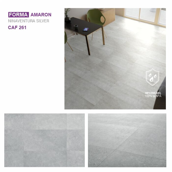 Panourile vinilice Ribeira Silver sunt alegerea perfectă pentru cei care apreciază finisajele naturale și elegante. Inspirate de calcarul autentic, acestea se remarcă prin detalii și dungi subtile, care le conferă un aspect realist și un caracter unic. Colecția de pardoseli SPC Amaron FORMA combină aspectul estetic al gresiei cu avantajele tehnologiei SPC (Stone Plastic Composite), fiind rezistente la apă, ușor de întreținut și simplu de instalat. Pardoselile SPC cu aspect de gresie oferă un aspect elegant și sofisticat oricărui spațiu, fie că este vorba despre bucătărie, baie sau alte zone cu trafic intens. Plăcile SPC din colecția Amaron FORMA au dimensiunile de 91,4 x 45,7 cm cu suprafața de 0,418 m2 . Cutia cu Amaron FORMA conține 5 plăci și face 2,088 m2 Unitatea de măsură pentru pardoseli este metrul pătrat. Adăugați în coș metrajul necesar, cu zecimale utilizând punct între cifre.Pardoseala SPC ARBITON colecția AMARON FORMA, Ninaventura SILVER, CAF 261