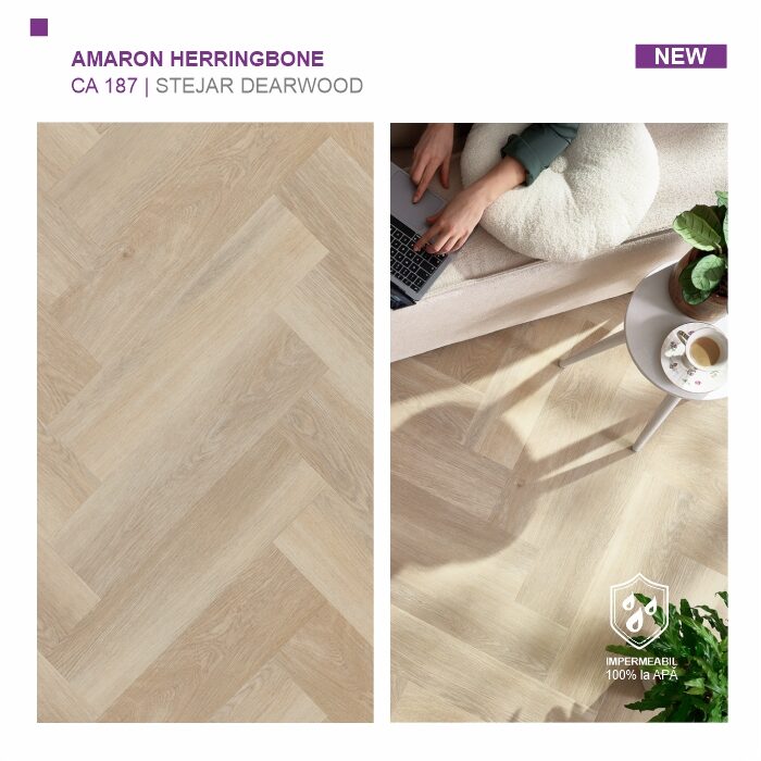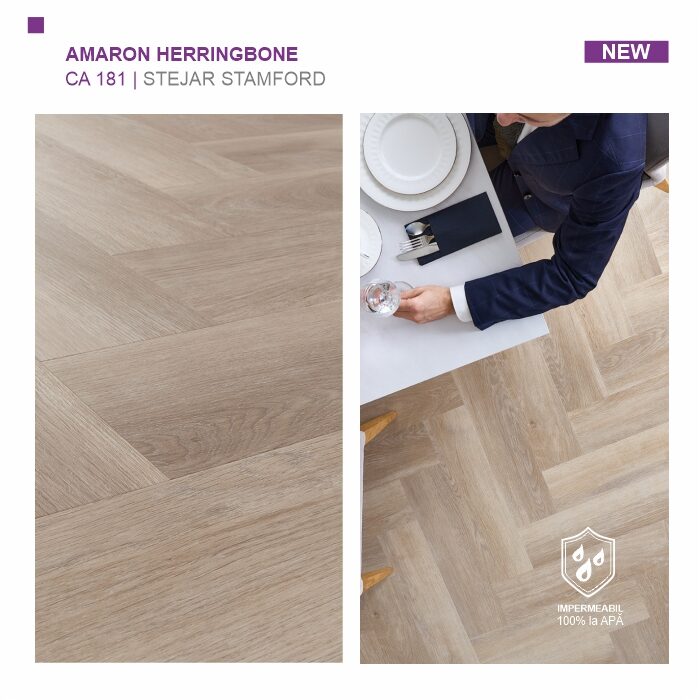 Pardoseala SPC Amaron Herringbone este special concepută pentru stilul heringbone. Este prima pardoseală heringbone din lume cu baza din HD MINERAL CORE ®. Este pardoseala absolut ideală pentru pardoseala cu sistem de încălzire, precum și pentru băi și bucătării.