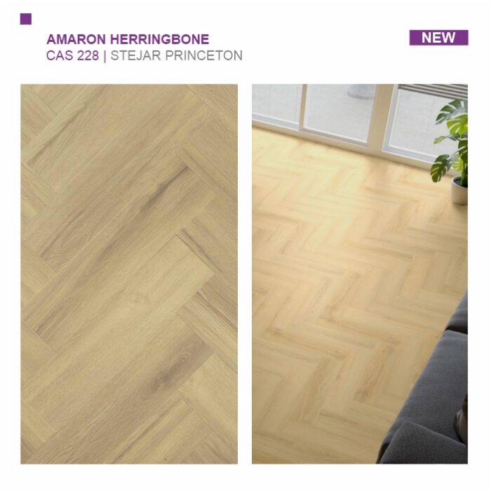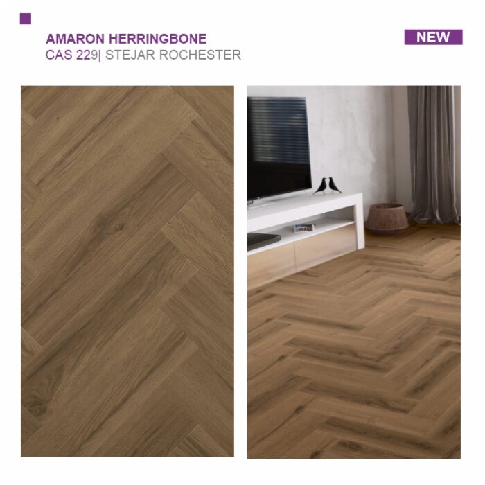 SPC Amaron Herringbone – primul vinil din lume cu model de tip jgeab pe bază minerală HD MINERAL CORE®. Ideal pentru încălzirea prin pardoseală, băi și bucătării. Nu necesită spații de compensare la instalare, permițând crearea unui acoperiș uniform care imită parchetul natural. Panourile au un grad ridicat de rezistență la uzură (23, 33, 42), fiind potrivite pentru condiții foarte exigente. Aspectul este deosebit datorită aranjamentului în care plăcile sunt așezate într-un unghi de 90 de grade una față de cealaltă, creând un model în zig-zag.