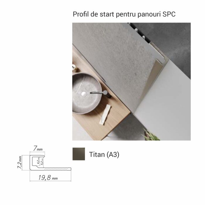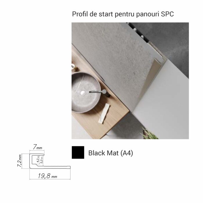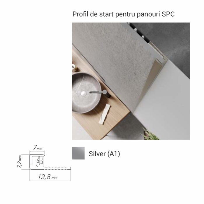 Profil de start pentru începutul sau finalul montajului cu panouri SPC de 4 mm. Disponibil în culorile silver, titan și negru mat, pentru un finisaj complet și profesional. Potrivit pentru marginea inferioară, laterală sau superioară a decorurilor SPC aplicate pe pereți, în băi, holuri, livinguri sau spații comerciale.
