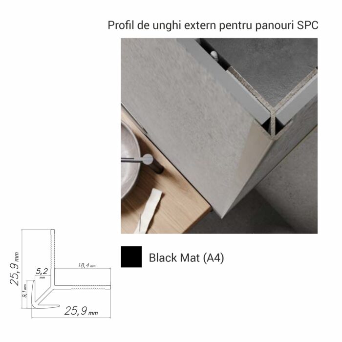 Profil de colț exterior cu muchie vizibilă subțire, pentru un finisaj minimalist și elegant. Compatibil cu panouri SPC de 4 mm. Disponibil în culorile: silver, titan și negru mat. Perfect pentru colțurile exterioare în proiecte de amenajare rafinate: livinguri, spații comerciale, showroom-uri, birouri sau băi cu design curat.